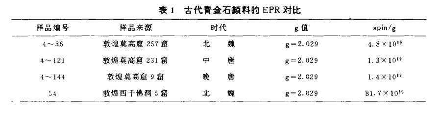 阿富汗青金矿物、敦煌莫高窟、敦煌西千佛洞北魏、中唐、晚唐三个时代的青金颜料、 国产合成群青三类物质其EPR谱图都有g = 2.029峰,该峰与已知物s3-的EPR值相近。实验结果表明,青金和合成群青的EPR谱应是硫自由基提供的,青金的颜色及其色调深浅程 度与此有关,与前苏联学者对青金的研究结果基本一致。