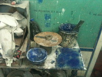从矿山下来,没有感觉太累,在办事处像松了发条的玩具,动也不想动。白天在沙发上都不是正经坐着而是斜着躺着。第二天夜晚仍然睡得奇香。早上起来后,才听门房说另外几个阿富汗伙伴忙了一夜,把第一车矿山上下来的原石过磅,记录,码放在一个集装箱了。运货车早上已返回,并且等几个地点汇集完挑选好的原石后,还要再运来,时间大约三天。我们利用这个空间又去了青金商店,看他们电话中所谈的优质料。电话中一再保证的优质料实在不敢恭维,香港甚至广东都是这种普通料,看我们都笑,老板却是煞有其事的说,差的都卖给巴基斯坦和中国人了。这是留得好的,也确实有部分好的,价格奇高还很少,手续都很麻烦,只能看看无功而返。到喀布尔的又一天去看了内政部后面戒严区里的小工厂,本地传统的石头加工厂,和以前一样,只是更忙了。除了整块的成品,更多的是用切片黏合的碗,盘,花瓶等。用几种颜料和化学试剂调和的胶是主要原料,很远就闻到刺鼻的“苯”成分,有没有更多的有毒分子不得而知。阿富汗人就是在这种没有任何保护的作坊里生产畅销品,还一个劲让我看胶水来自中国,说又便宜又好用。当我告诉他们这有毒时,他们都不以为然,并且说,没关系的,没有人知道。