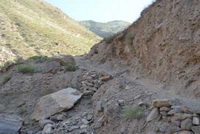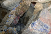 天亮得到战事结束后,决定先上矿山,返回再看另外两处。虽说在2003年第一次到达矿山后,又去过多次,最近一次也是在两年以前的2012年,回想起来,还是早期最安全,只是中间的一段路十分惊险,不是经常往返的当地人很容易出车祸。因此,自古以来,这个矿口,就有一个行业,是专门用毛驴运送青金下山的队伍。这个队伍现在人员有“教拉姆镇”组成,大约十五人。有时候会根据需求临时组织成三十多人,归“法伊兹~汗”领导,当地土话发音和中国十分接近,称这个行业“脚力”。可以说想拿到品质好的,形状好的青金,离不开已经存在于兴都库什几千年的“脚力”行业。(