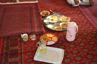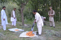 在矿山,青金和各种宝石一样,都有大量从业人员,关联行业很多。从合作伙伴给我们准备的院落,安保,到开采原石运送进来的炸药,空压机的服务商,钻杆、钻头的采购,负责和政府矿产办公室和军警打交道的专业人员,和矿山几条小路上的“塔利班”的联络、疏通的保障员,都是此行业不可分割的关联行业,就算时间紧张,我们一行人等,还是要耐心的一一和他们见面沟通。在夸张的活泼的气氛下谈了合作、通融、平台、利益分账等重要事情,在很多重要环节,需要安排在比较私密的房间,这时候他们把准备好的餐饮食物摆放齐备,才开始正式谈话。出于一种认识我告知周围的人我并不饿的情况下,被他们以都是多少年的老朋友了,不需要客气,我盛情难却、就在他们的白天封斋的情况下,大快朵熙。(