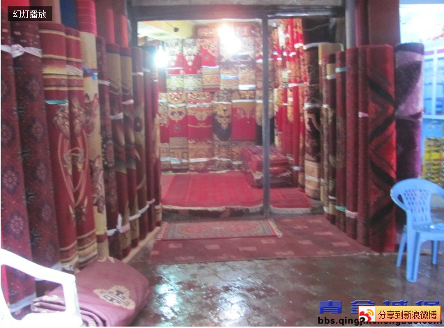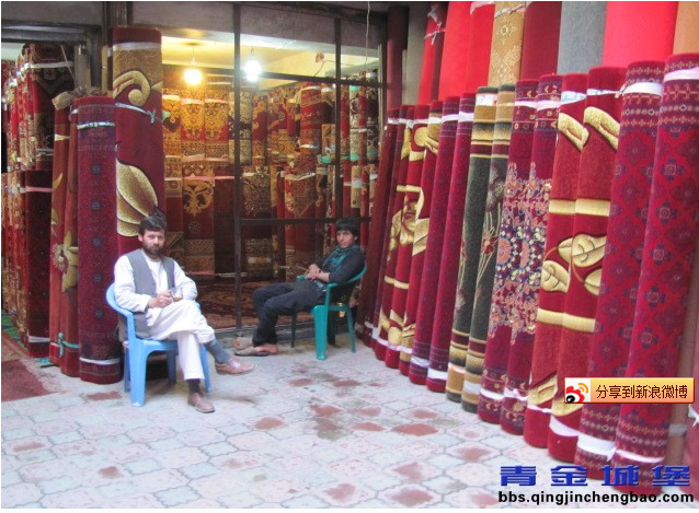 好的地毯式每两平方英尺宽就上架一个女工,当然男工也可以,只是很少,通常要一年、两年甚至更长时间下架一块儿手工毯,能快的就是粗道货,也不能算高档。只有细密的地毯完工才受富人追捧,这种地毯一定是慢工出细活了。中阿商贸金桥网在一个阿富汗商人带领下,到他的市场去聊天,这一个地毯交易市场,具有各种民族风格的代表,要知道,很多图案是有家族风韵,记在织工的脑子里,代代相传。